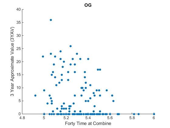 Okay, all that to say that I’ll be trying to predict the 3 year Approximate Value (3YAV). I’ll look at combine data from 2000 to 2011, which I got from nflcombineresults.com. The first step in any data trek should be to look at the raw data. Below I show some scatter plots of the 3YAV vs. combine measurements, grouped by position. The first plot is for the forty yard dash for offensive guards. Each dot represents a player and the coordinate gives his forty time and subsequent 3YAV.