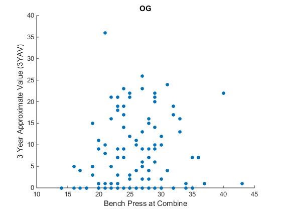 While there is tons of variation, it’s cool to see a pattern that faster guards tended to have more NFL success. Compare this to the bench press: