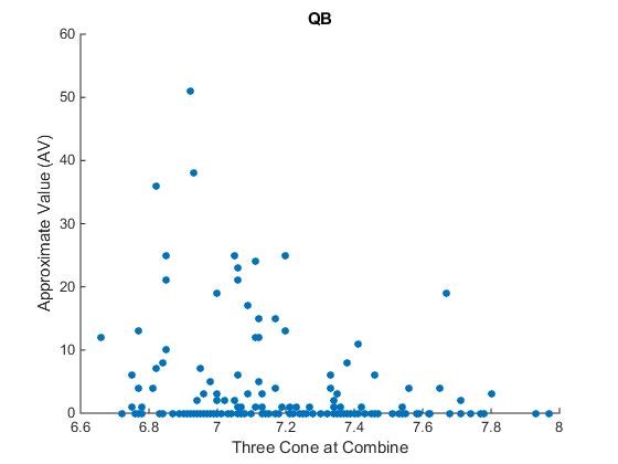 Alright, now let’s start to dig in. The goal is: given a player’s combine performance, predict how good he will be NFL, as well as where he will go in the draft. How do we quantify NFL success? Ideally we’d just have one number that combines all aspects of a player’s performance. The Approximate Value (AV), created by Pro Football Reference founder Doug Drinen, is a stat that attempts to do this. It consists of a formula for each position that and is calculated on a yearly basis. The next question becomes, over what period should we calculate the AV? On one hand, you want to take in account the entire career of a player to fully reflect how valuable they were. But this leads to some obvious problems. First off, it would make it very hard to compare older players, who have had more years to accumulate AV, to younger players. Second, it can be counterproductive in terms of our main goal. We don’t want a journeyman, who happens to bounce around different teams and accumulate AV over time to be deemed better than a star who happens to have a freak injury and retires after 3 years (e.g. Bo Jackson). What we really want to know from the combine is, “Does he have what it takes to make it in the NFL?” or “Will his freakish abilities actually translate to the field?” With this in mind, I propose that what we should look at the total AV over a player’s first three years. This is what he hope to be able to predict when looking at combine numbers.